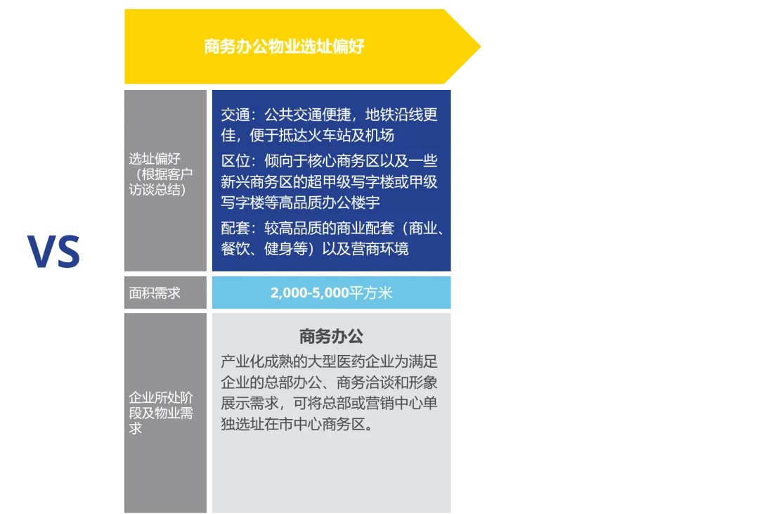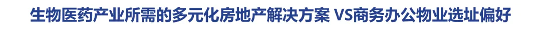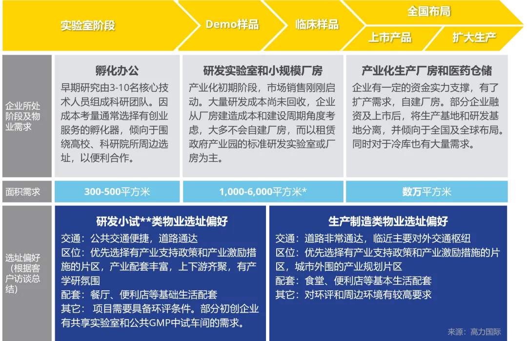 从生物医药产品的研发流程和各项业务功能来看,不同阶段企业会有不同的选址动因,也对物业类型、面积段配置和配套有着不同的偏好。总体而言,生物医药企业选址所涉及的物业类型主要包括孵化办公、研发实验室、产业化生产厂房和医药物流仓储等。