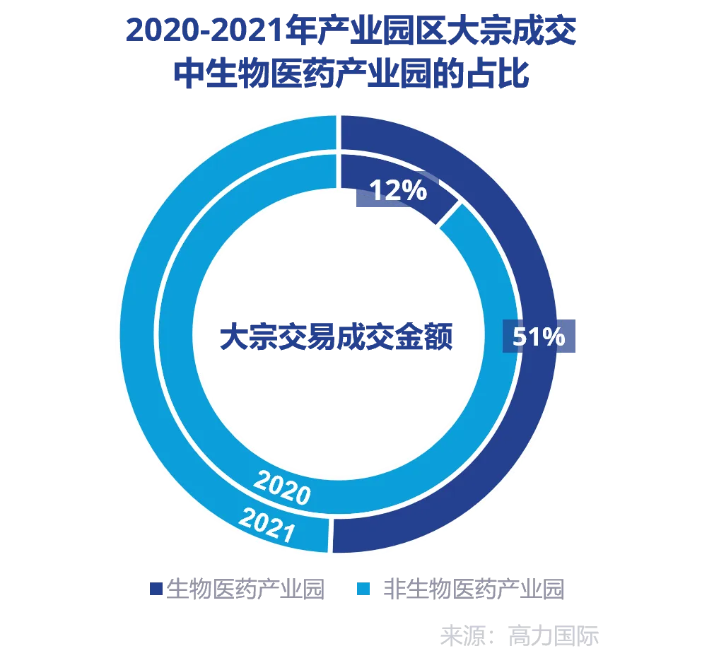 伴随租赁需求和租金走势的稳健上扬,生物医药产业园也迅速获得投资者的青睐。2021年,上海生物医药产业园的大宗成交金额共人民币61.6亿元(9.7亿美元),较2020年的增长了近5倍,占产业园区总成成交量的百分比大幅提升到51%。