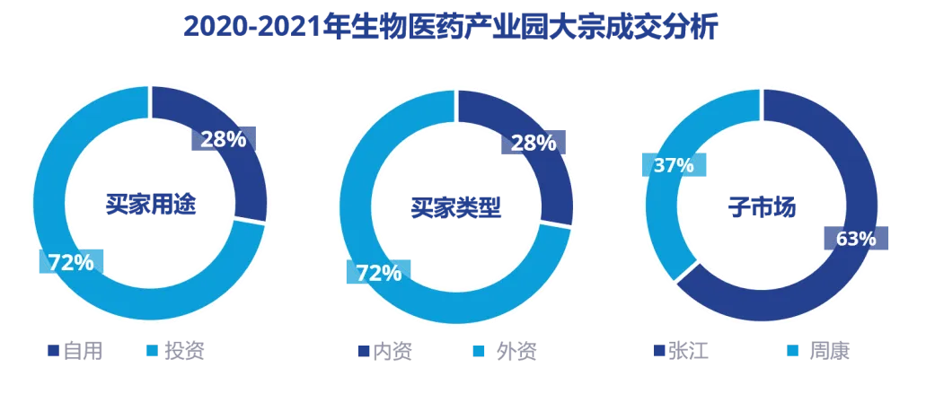 从2020年至2021年度的全部生物医药产业园成交案例来看,外资买家全部以投资为目的,而内资买家均为生物医药企业且交易目的均为自用。就区位而言,成交主要集中在张江,但随着张江可交易标的稀缺,针对生物医药的投资需求已经开始扩散,周康也有不少标的物业成交,而之前关注度相对较低的浦江和外高桥也已进入投资者的视野。