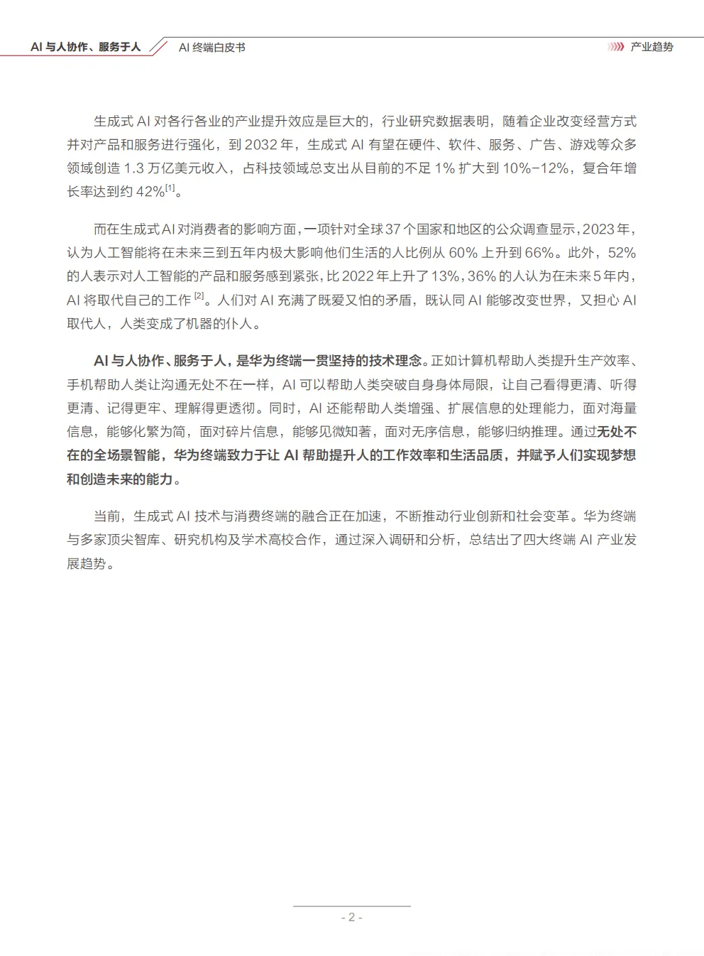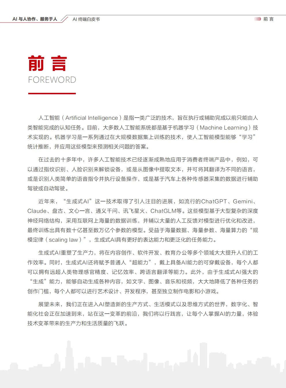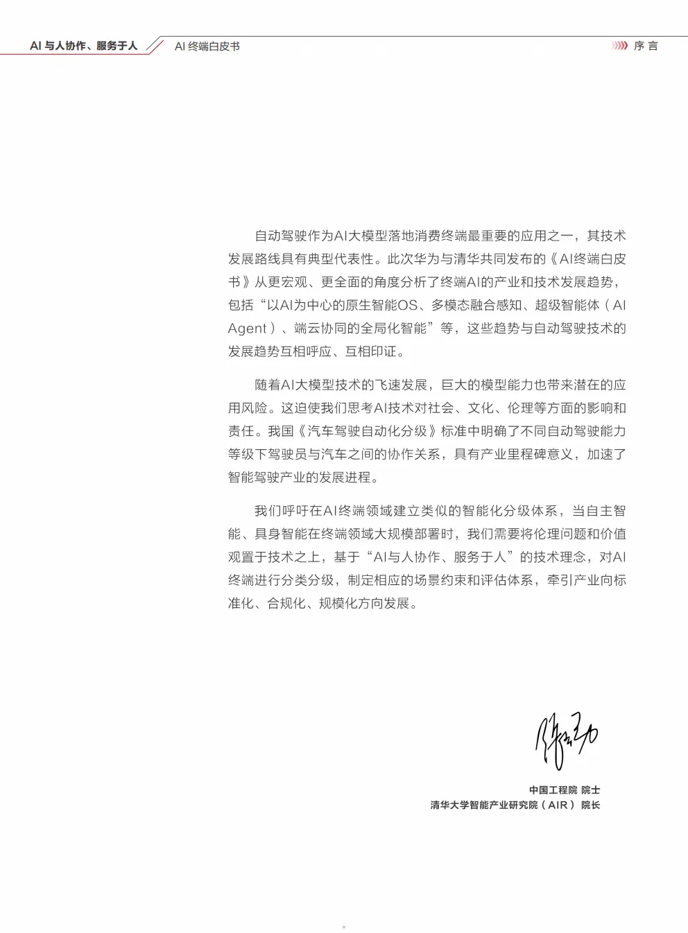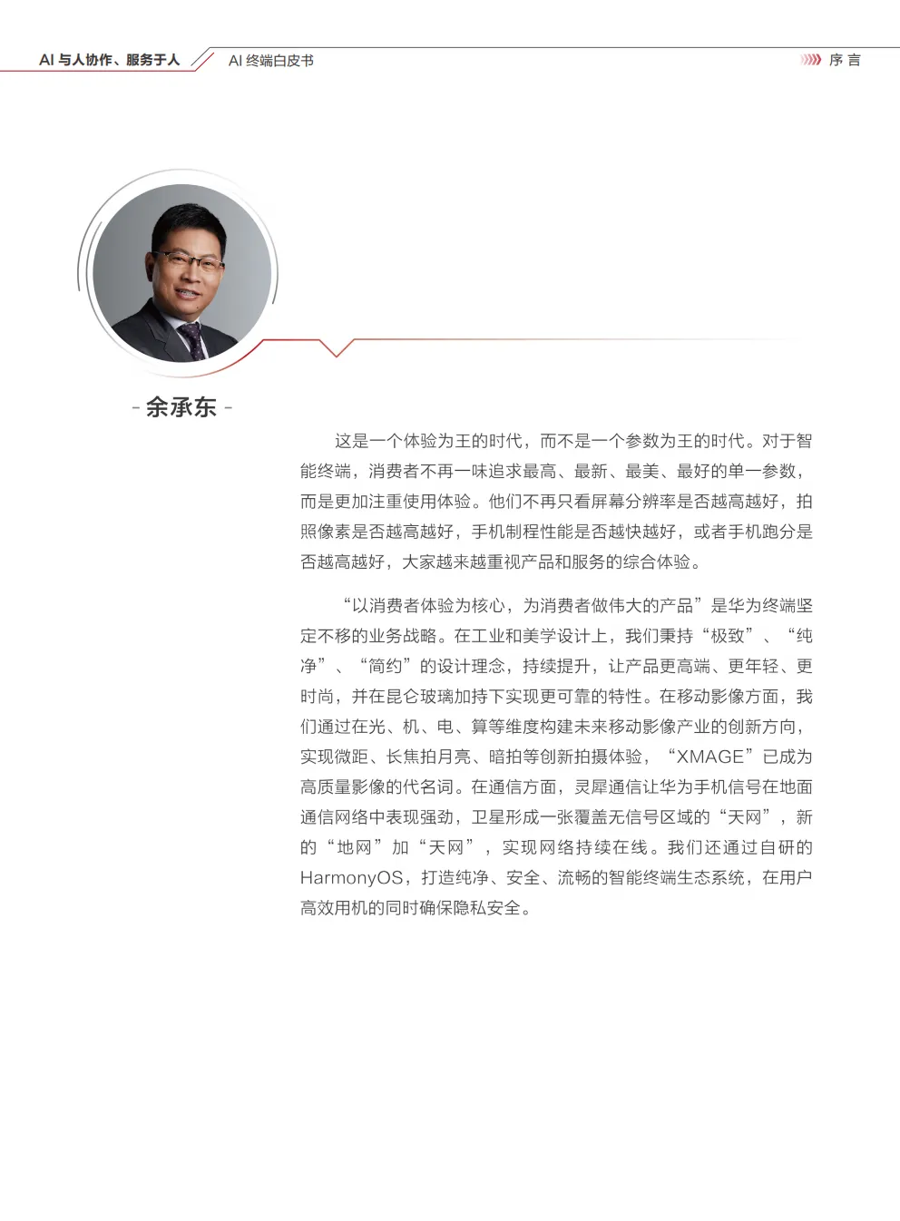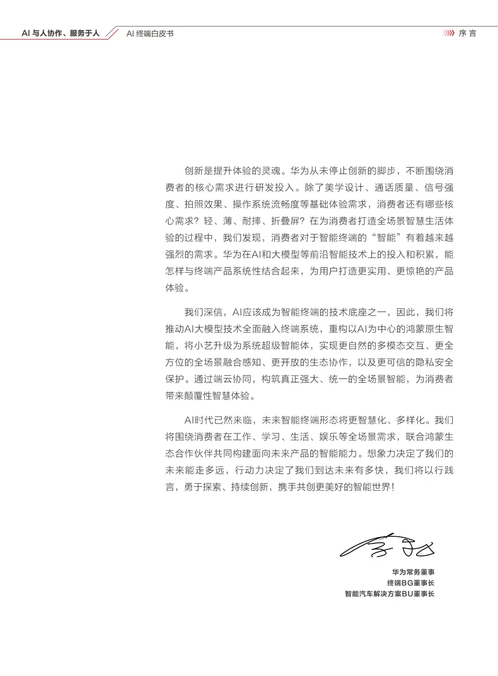 这份《AI 终端白皮书》由华为联合清华大学发布,核心秉持AI 与人协作、服务于人的技术理念,立足体验为王的时代背景,深度分析 AI 终端的产业趋势、未来场景、智能化分级标准与核心技术,并提出产业发展倡议,旨在推动 AI 大模型与终端产品深度融合,构建全场景智慧生活体验,引领 AI 终端产业标准化、高质量发展