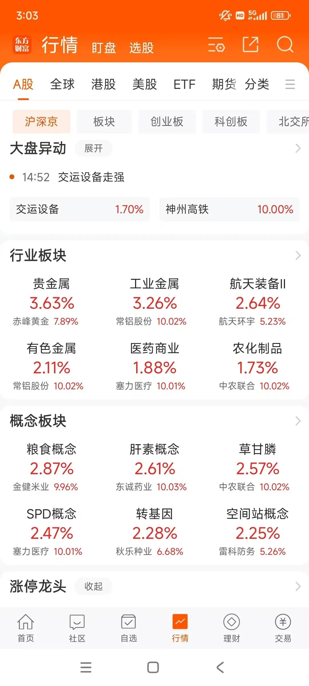 盘面上,贵金属、工业金属、医药商业、农化制品涨幅居前。赤峰黄金涨近8%,常铝股份、塞力医疗、中农联合涨停。另一边,科技成长方向集体承压,科创50跌0.84%,半导体、AI、CPO等板块普遍回调。