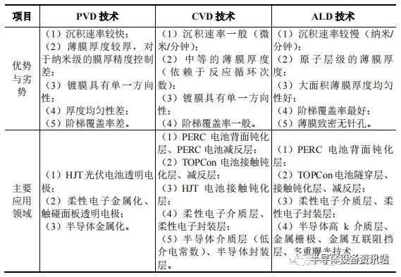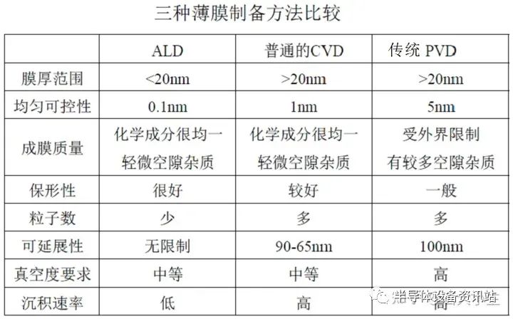 ALD:成膜均匀性好、致密无孔洞、台阶覆盖特性好、可在低温进行(室温—400℃)、可简单精确控制薄膜厚度、广泛适用于不同形状的基底、无需控制反应物流量均匀性。但缺点是成膜速度较慢。如用于生产纳米结构的绝缘体(Al2O3/TiO2)和薄膜电致发光显示器(TFEL)的硫化锌(ZnS)发光层。