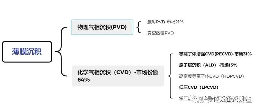 薄膜制备工艺按照其成膜方法可分为两大类:物理气相沉积(PVD)和化学气相沉积(CVD),其中CVD工艺设备占比更高。
