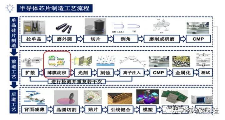 薄膜沉积是在半导体的主要衬底材料上镀一层膜。这层膜可以有各种各样的材料,比如绝缘化合物二氧化硅,半导体多晶硅、金属铜等。用来镀膜的这个设备就叫薄膜沉积设备。