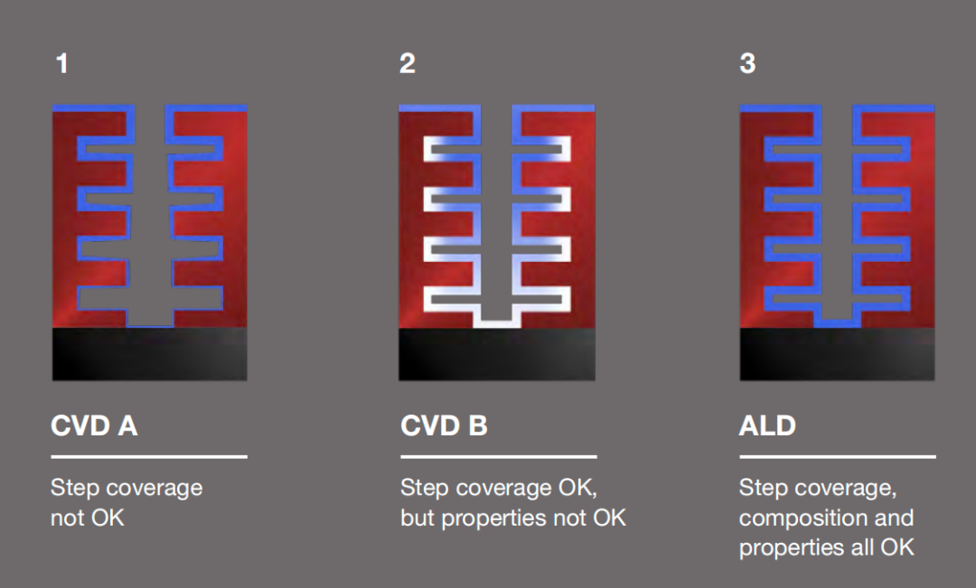 举例来看,ALD是唯一能够满足复杂3D堆叠结构(如3D-NAND)覆盖和薄膜性能要求的沉积技术。这从下图中可以很形象地看出,图中CVD A中沉积的薄膜(蓝色)并没有完全覆盖结构的下部部分;即使对CVD进行一些工艺调整(CVD B)实现了覆盖,但是底部区域的薄膜性能和化学成分很差(图中白色区域);相比之下,使用ALD技术则显示了完全的薄膜覆盖,而且在结构的所有区域都实现了高质量和均匀的薄膜特性。