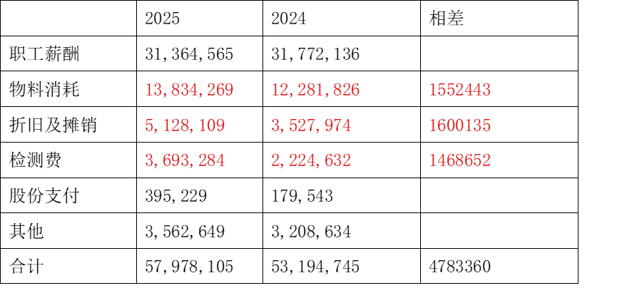 物料消耗、折旧及摊销、检测费三项增加较多,这些都牵涉到原材料,应与原材料价格上涨有关,所以2025年研发费用增加只是原材料价格上涨被动引起的,并没有特殊原因。