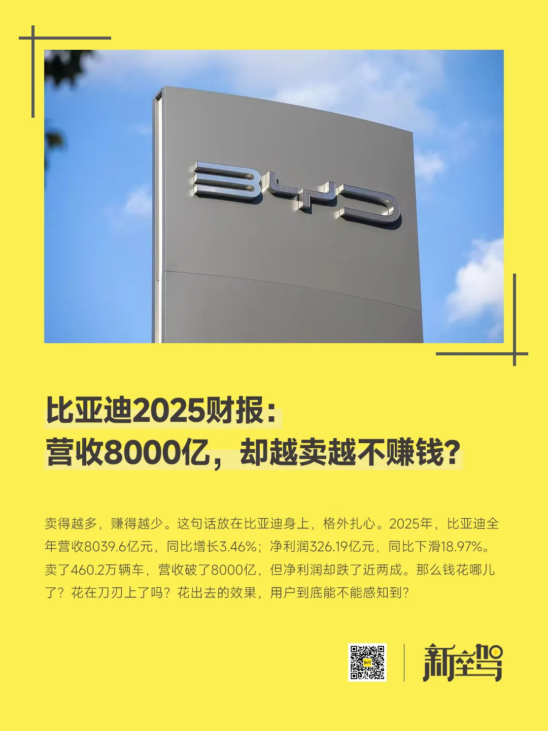 这句话放在比亚迪身上,格外扎心。2025年,比亚迪全年营收8039.6亿元,同比增长3.46%;净利润326.19亿元,同比下滑18.97%。卖了460.2万辆车,营收破了8000亿,但净利润却跌了近两成。