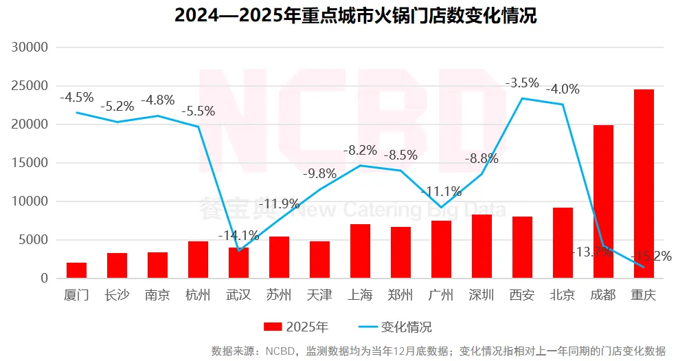 5、从NCBD(餐宝典)对重点城市的火锅门店监测情况来看,重庆、成都仍然是火锅门店最多的城市;2025年,几乎所有重点城市的火锅门店都有所减少,重庆、武汉、成都、苏州、广州五大城市火锅门店减少均超过10%