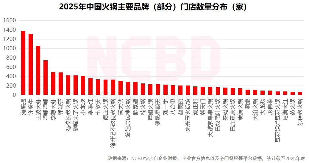 6、截至2025年底,海底捞、许府牛等品牌门店较多;大多数火锅品牌的门店数均在1000家以下