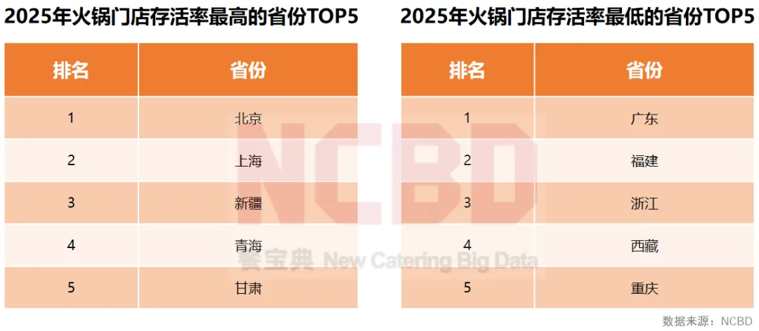 10、NCBD(餐宝典)数据显示,2025年火锅门店存活率最高的五个省份分别是:北京、上海、新疆、青海、甘肃;火锅门店存活率最低的三个省份是广东、福建和浙江