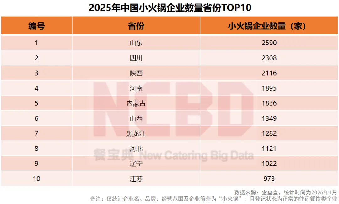 4、NCBD(餐宝典)数据显示,2025年新成立火锅企业数量最多的省是四川,数量占全国总量的13.0%;山东、贵州分别位居二、三位;TOP10省份新成立火锅企业占全国总量的59.2%,接近六成