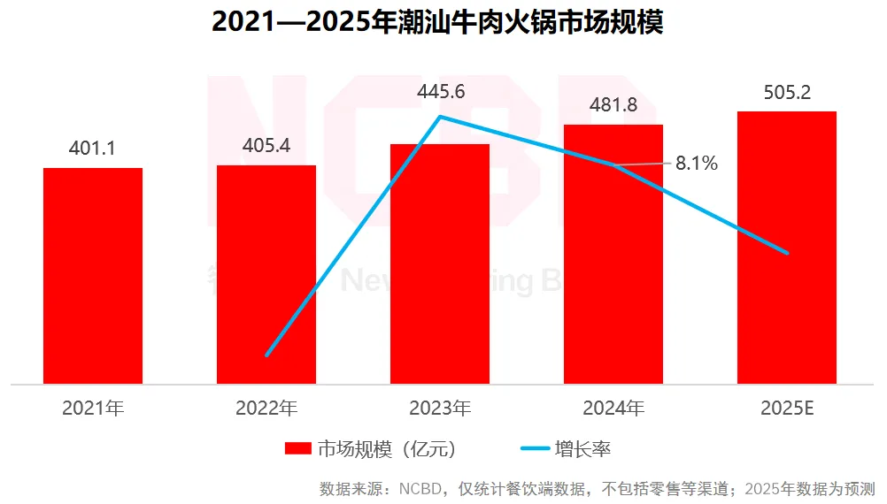 (1)NCBD(餐宝典)数据显示,2024年潮汕牛肉火锅市场规模达481.8亿元,同比增长8.1%,2025年预计超500亿元