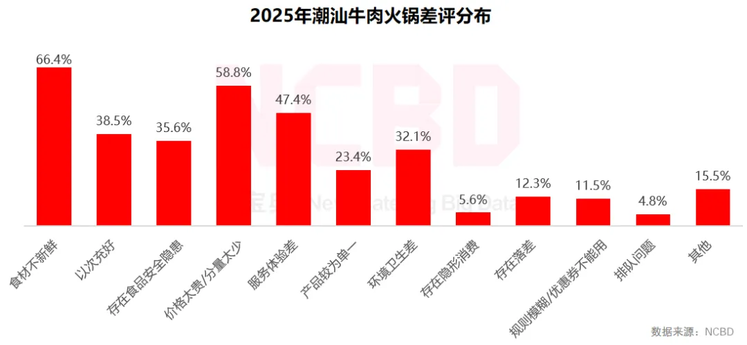 (5)潮汕牛肉火锅的差评主要集中在食材不新鲜、性价比低/份量小以及服务体验差等方面,其中以食材品质问题最为突出
