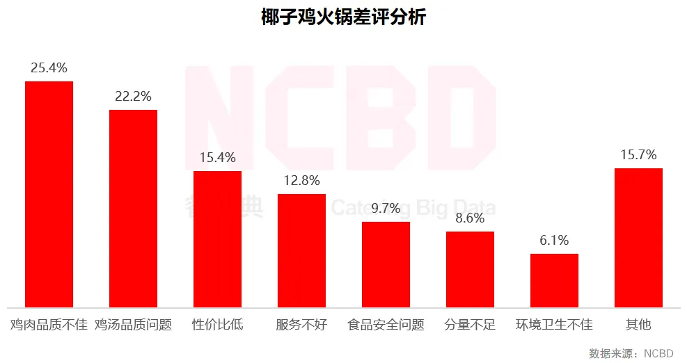 (4)椰子鸡差评主要集中在鸡肉品质、汤底品质以及性价比三个方面,占总差评的60%以上;其次是服务和食品安全问题