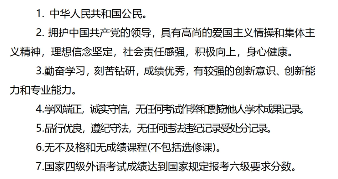 学业成绩优异,课程无不及格记录,具有突出的创新能力和专业素养;恪守学术道德,无学术不端行为;遵纪守法且无违纪受罚记录,同时要求通过国家大学英语四级考试并达到报考六级资格。