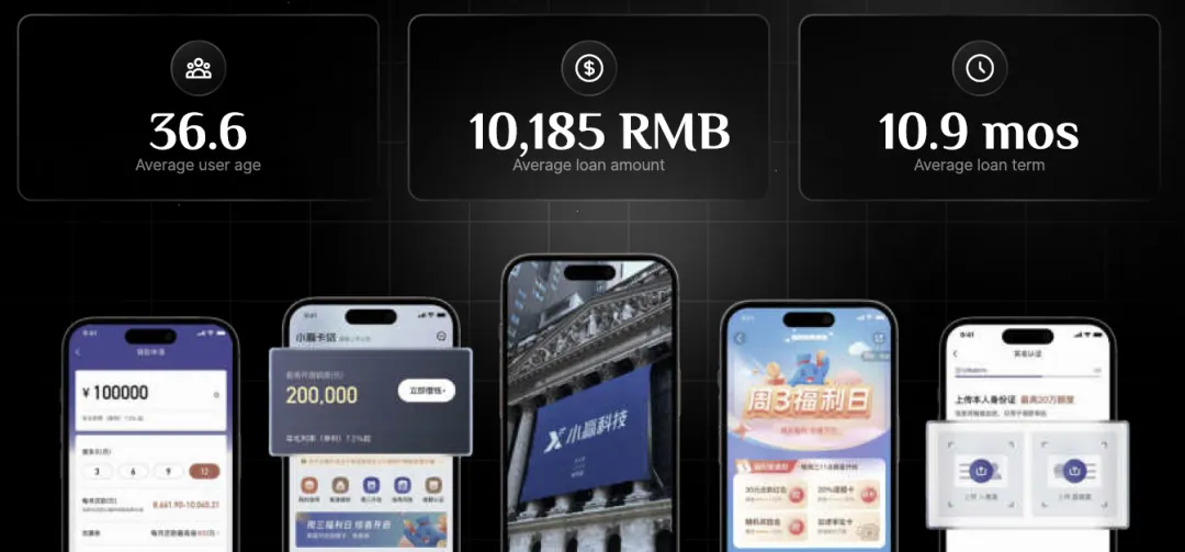 小赢科技旗下主打产品为小赢卡贷,客群平均年龄约为36.6岁,平均贷款额度10185元人民币,平均贷款期限约为10.9个月: