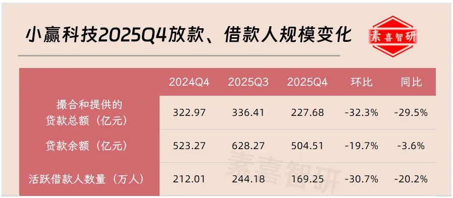 数据显示,截至2025Q4,小赢科技在贷余额为504.51亿元,较2024Q4的523.27亿元下降3.6%;季度放款规模227.68亿元,环比下降三成;整个2025年放款规模1305.52亿元。