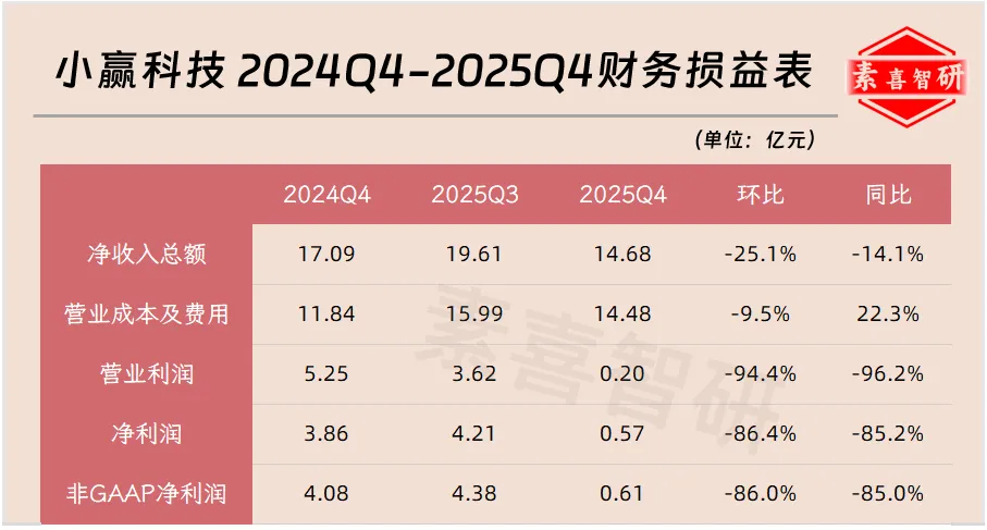 2025Q4,小赢科技净收入为14.678亿元,较2024Q4的17.09亿元减少了14.1%,环比下降25.1%。而从2025年全年度口径看,小赢科技收入76.394亿元,较2024年的58.718亿元增长30.1%。