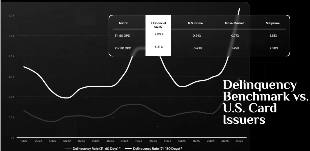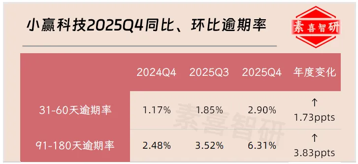 具体看,截至2025Q4,小赢科技31-60天贷款逾期率为2.90%(2024Q4为1.17%),91-180天贷款逾期率为6.31%(2024Q4为2.48%),同比呈现翻倍趋势: