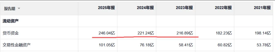 2025年,货币资金高达246亿,交易性金融资产101亿,合计占总资产的521亿元的66.6%。