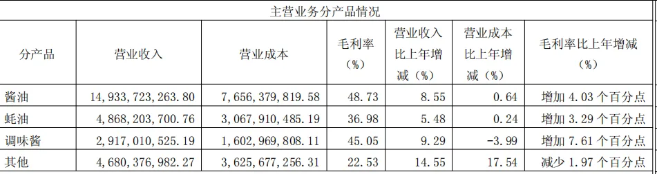 2025年,公司酱油/蚝油/调味酱分别实现营收149.34亿/48.68亿/29.17亿,同比增速8.55%/5.48%/9.29%。
