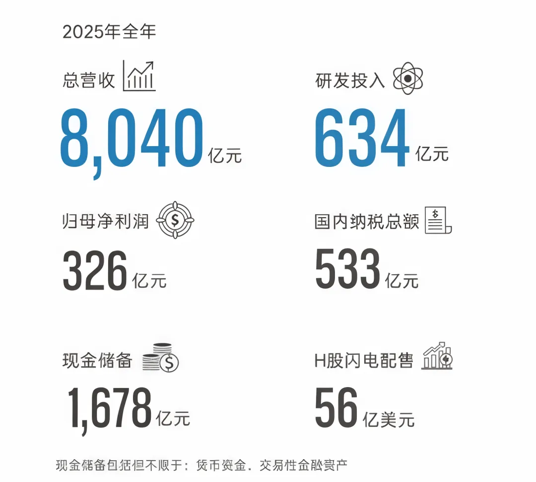 3月28日,比亚迪发布2025年年度报告。数据显示,公司全年实现营业收入8039.65亿元,同比增长3.46%;归属于上市公司股东的净利润为326.19亿元,同比下降18.97%。按此计算,比亚迪2025年平均每日净赚约8930万元。截至年末,公司总资产达8837.30亿元,净资产2462.74亿元,分别同比增长12.81%和32.94%,资产结构持续优化。尽管利润有所回落,但比亚迪在多个业务板块取得实质性突破。2025年,公司新能源汽车销量再创新高,连续四年蝉联全球新能源车销量冠军,并首次跻身全球汽车集团销量第五位。全年整车及相关业务营收6486.46亿元,占总营收80.68%。其中,海外销量首次突破百万辆,达104.96万辆,同比增长145%,稳居中国新能源车出口第一。高端化战略成效显著。仰望、腾势、方程豹三大品牌合计销量接近40万辆,同比大幅增长,推动产品结构向高价值区间升级。同时,比亚迪加速技术迭代,2026年3月正式发布第二代刀片电池,能量密度提升超5%,支持车型续航突破1000公里,并彻底解决低温充电慢等行业痛点。该电池在满足自供需求的同时,已向多家国际主流车企供货。储能业务成为2025年最大亮点之一。公司全年储能系统出货量突破60GWh,跃居全球第一。其产品覆盖电源侧、电网侧、工商业及家庭全场景,已为全球650多个大型项目提供解决方案,业务遍及110余国。年内,比亚迪与沙特电力签署12.5GWh电网侧储能订单——全球迄今最大单体项目,并已启动交付。9月推出的搭载2710Ah超大容量刀片电池的新一代储能系统,创下单元容量与体积利用率两项全球纪录,并具备IP66防护等级。钠离子电池、新一代PCS等前沿技术也实现工业化落地。在补能基础设施方面,比亚迪同步推进“闪充中国”战略,推出1500kW量产单枪功率最大的闪充桩,计划2026年底前建成2万座站点,覆盖城市核心区与高速路网,并结合自研储能系统构建对电网友好的智能充电网络。此外,公司在光伏、手机部件及轨道交通等领域持续布局。光伏业务依托全产业链能力进入超百个国家,并通过海外本地化生产深化全球运营。作为技术驱动型企业,比亚迪2025年研发投入达634亿元,专利总数超7.1万项。公司表示,未来将继续聚焦电动化、智能化与全球化,强化核心技术自主可控,推动新能源生态体系全面升级。