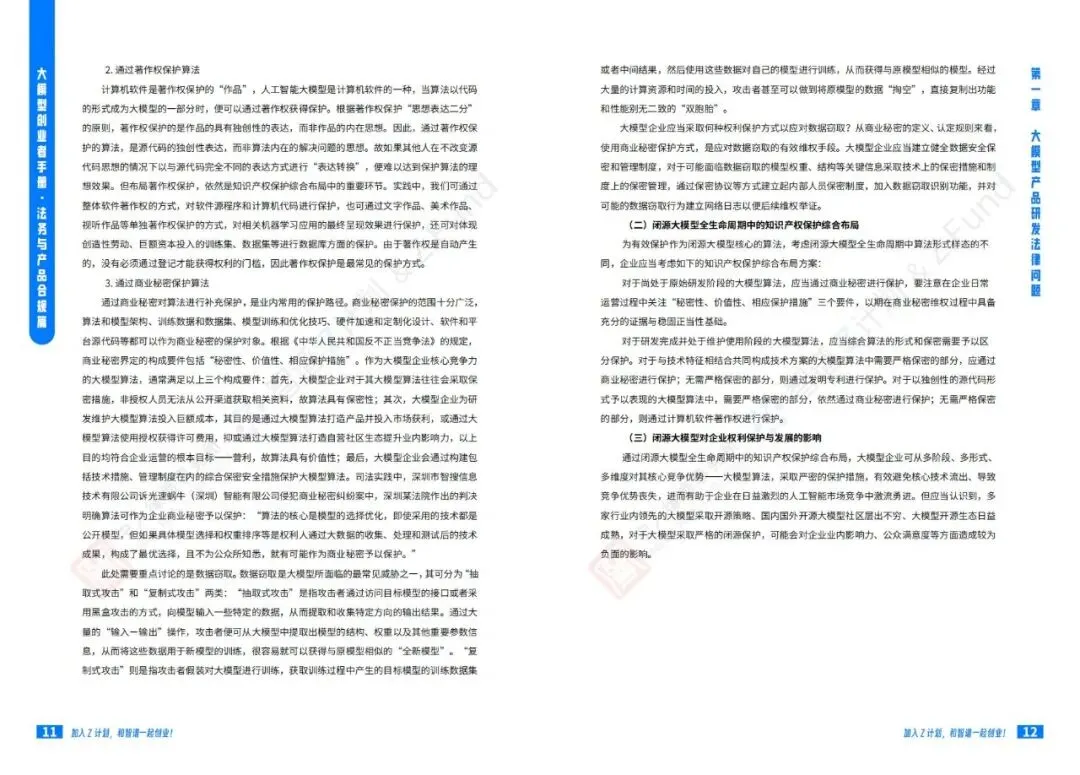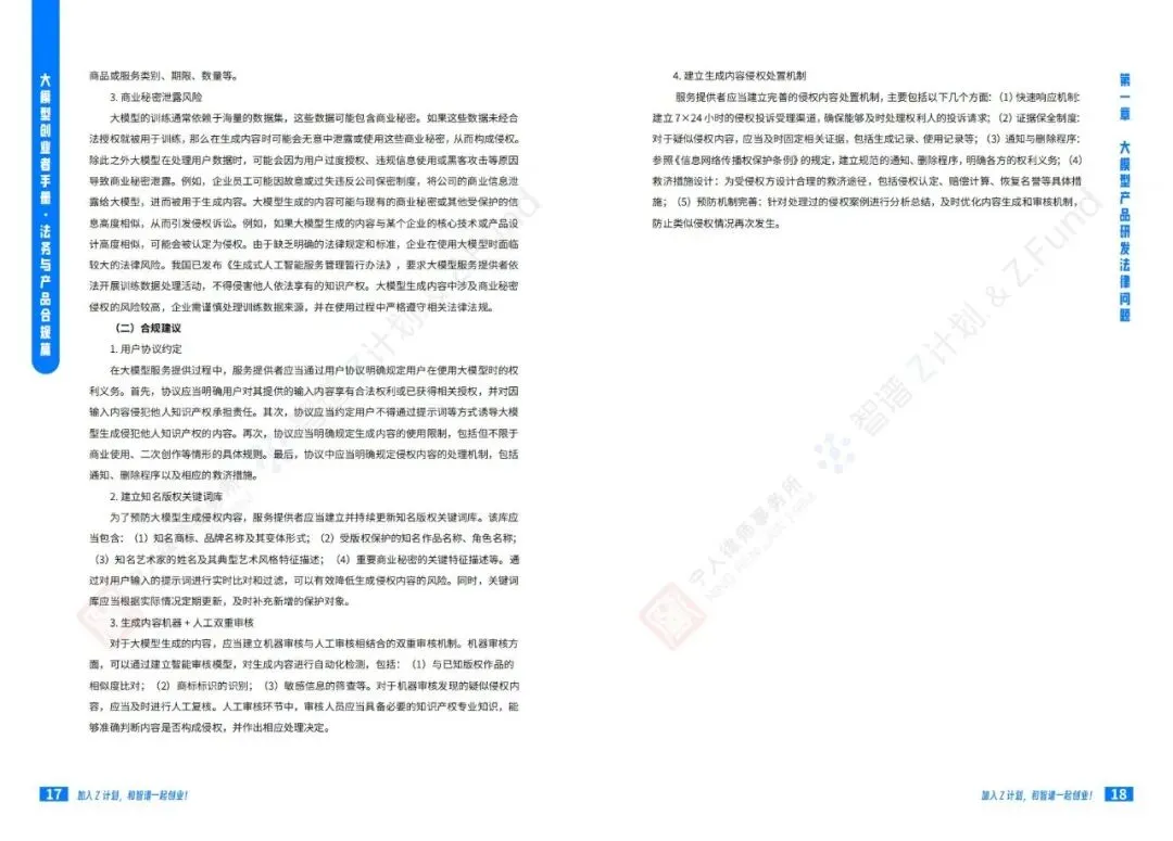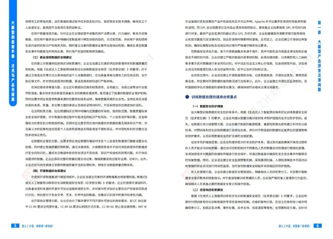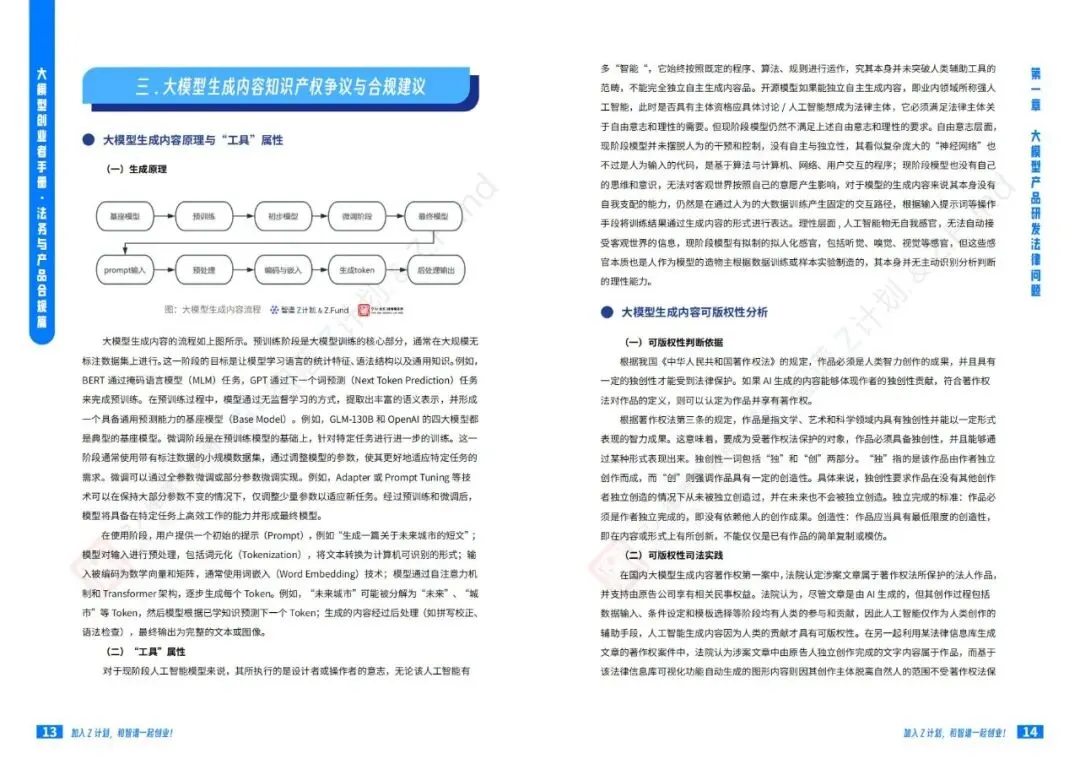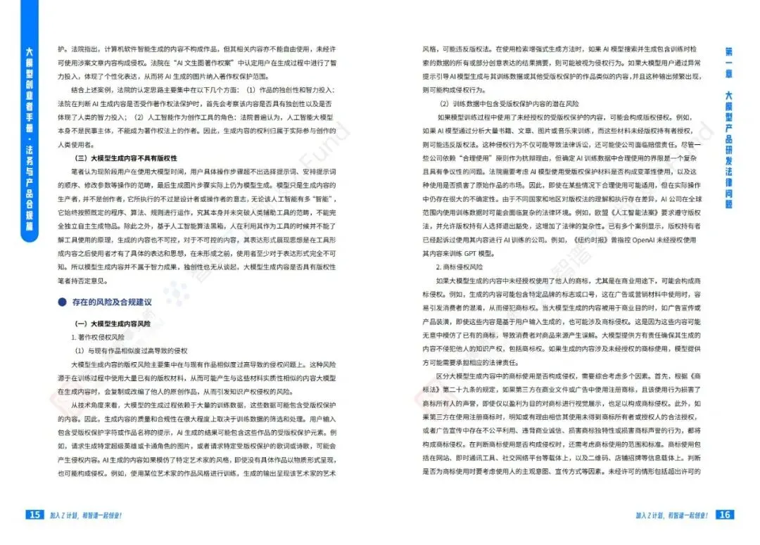 智谱AI大模型产业加速器与宁人律师事务所前段时间联合发布了一份技术报告《大模型创业者手册:法务与产品合规篇》:聚焦大模型创业过程中的法律风险和合规要点。手册系统性地从产品研发、产品运营到产品出海三个维度,详尽阐述了大模型企业面临的法律挑战及应对策略。该手册是Z计划(智谱面向未上市初创企业与优秀独立开发者/团队的创新加速计划)与Z基金(15亿元人民币规模的大模型生态投资基金)为创业者提供的重要实操指南。公号后台回复“9”,在AI大模型·领地知识星球查看~如欲查看完整版文件,请扫描下方二维码加入“AI大模型·领地”获取。说明:本文部分文字与图片资源来自于网络,分享此文是出于传递更多信息之目的,若有来源标注错误或侵犯了您的合法权益,请立即后台留言通知我们,情况属实,我们会第一时间予以删除,并同时向您表示歉意。AI大模型·资料·藏经阁