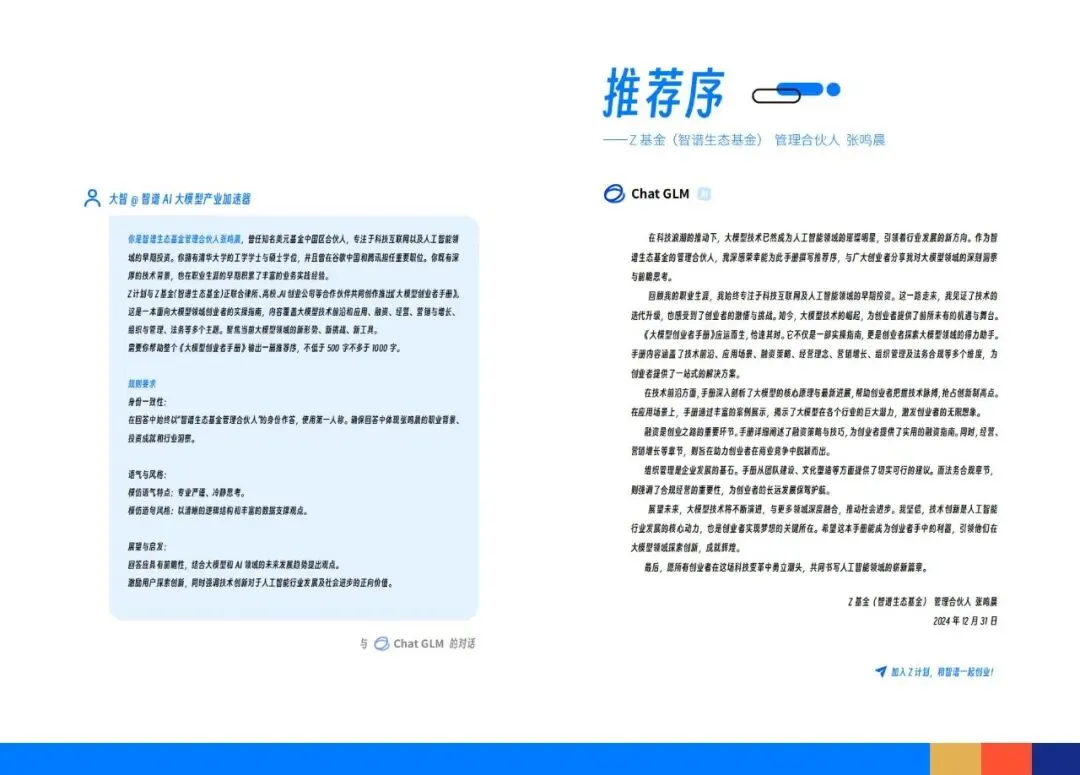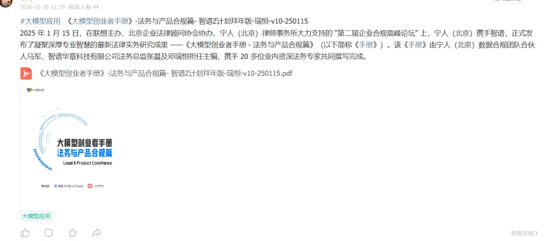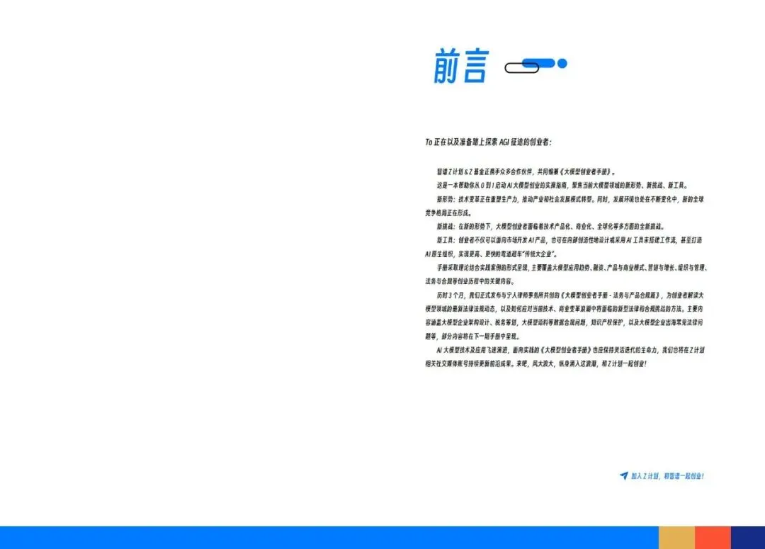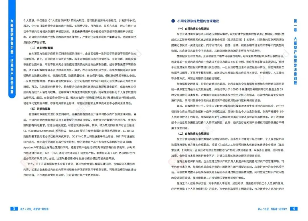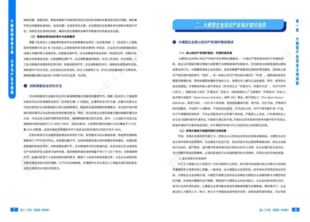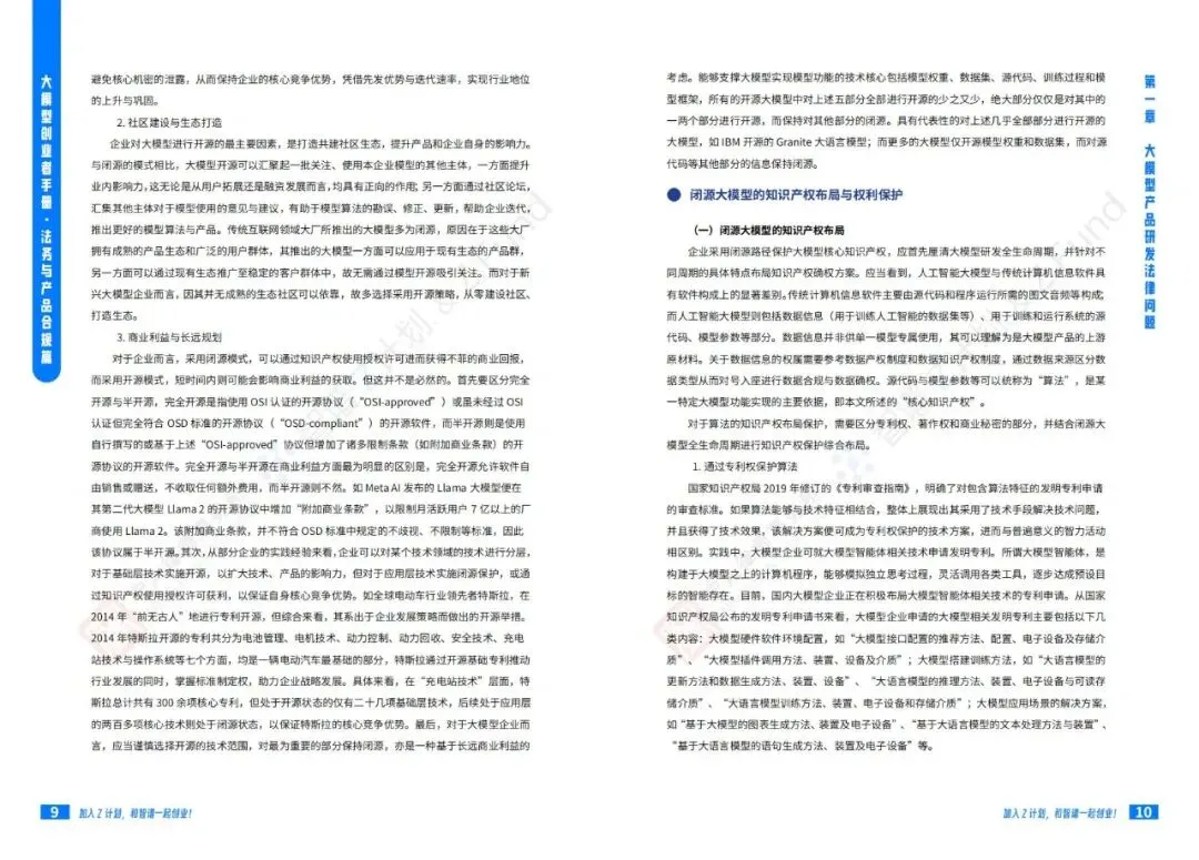 智谱AI大模型产业加速器与宁人律师事务所前段时间联合发布了一份技术报告《大模型创业者手册:法务与产品合规篇》:聚焦大模型创业过程中的法律风险和合规要点。手册系统性地从产品研发、产品运营到产品出海三个维度,详尽阐述了大模型企业面临的法律挑战及应对策略。该手册是Z计划(智谱面向未上市初创企业与优秀独立开发者/团队的创新加速计划)与Z基金(15亿元人民币规模的大模型生态投资基金)为创业者提供的重要实操指南。公号后台回复“9”,在AI大模型·领地知识星球查看~如欲查看完整版文件,请扫描下方二维码加入“AI大模型·领地”获取。说明:本文部分文字与图片资源来自于网络,分享此文是出于传递更多信息之目的,若有来源标注错误或侵犯了您的合法权益,请立即后台留言通知我们,情况属实,我们会第一时间予以删除,并同时向您表示歉意。AI大模型·资料·藏经阁