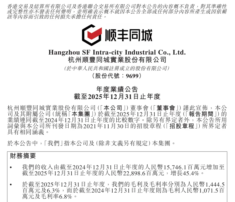 顺丰同城2025年财报:全年收入228.99亿元 净利润同比翻倍增长