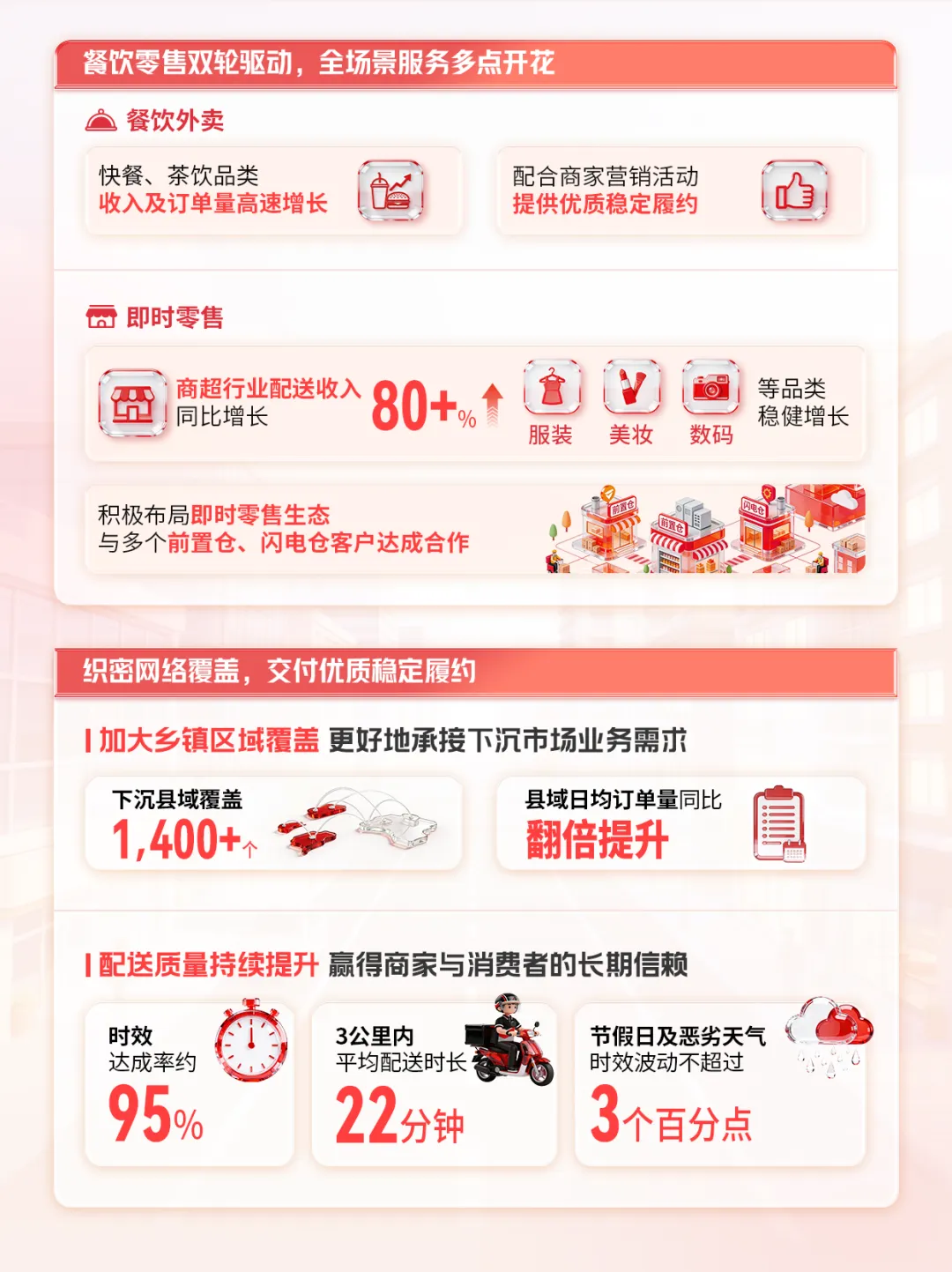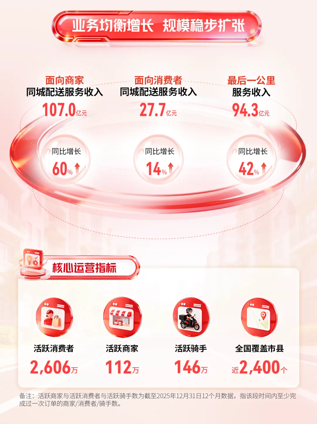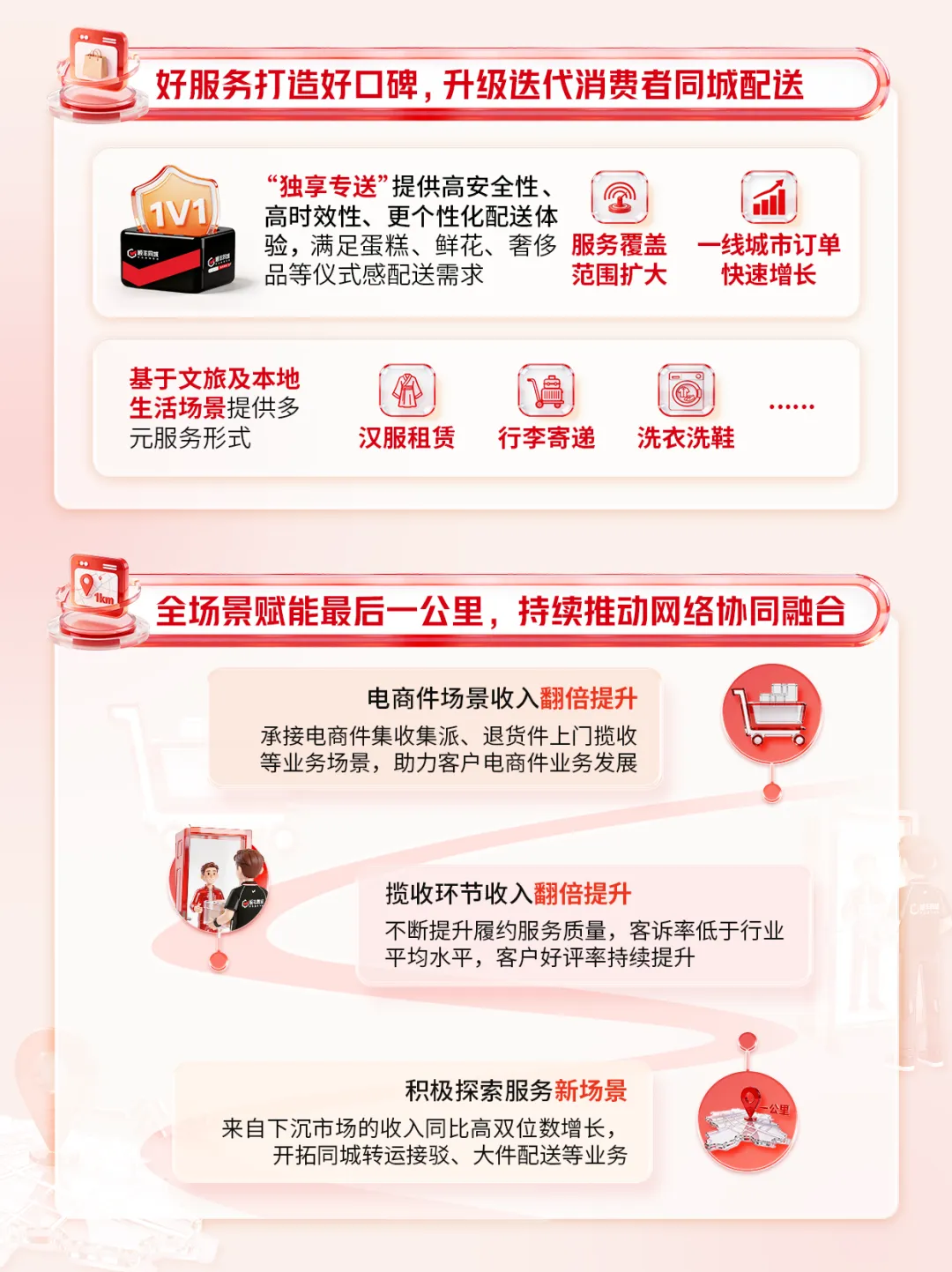 2025年全年,顺丰同城实现收入228.99亿元,同比增长45.4%;年活跃骑手扩大至约146万名,骑手人效同比提升30%。全面减少深圳存量的电动三轮中联即送拟将旗下蜂鸟即配(饿了么配送)业务主体公司落地莫城街道,并计划3年内在常熟打造中联即送“两基地两中心”车、电动两轮车,提升配送效率公告显示,顺丰同城全年实现收入228.99亿元,同比增长45.4%;同城配送服务的收入为134.67亿元,增长47.6%;最后一公里服务的收入为94.32亿元,同比增长42.4%;毛利及毛利率分别为14.45亿元及6.3%;本公司拥有人应占净利润及净利润率分别为人民币2.78亿元及1.2%;净利润同比翻倍增长,增速达109.7%;经调整净利润及经调整净利润率分别为4.15亿元及1.8%,经调整净利润同比增长184.3%;经营活动所得现金净额为3.95亿元,经营活动所得现金净额持续为正。面向商家的同城配送方面,顺丰同城以具有开放、灵活特性的即时配送网络,以及专业、高效与全场景的配送解决方案为商家赋能,保持广泛的商家合作。通过合作商户基数的增长及商户结构的调优,2025年,面向商家的同城配送服务实现收入人民币107.01亿元,同比增长60.0%。商家合作方面,服务商家规模持续增长,客户结构健康。报告期内,顺丰同城新增合作店超7900家。面向中小商家,顺丰同城持续拓宽获客渠道,优化合作链路,扩大合作商户规模,丰富合作商家类型。2025年,顺丰同城把握流量平台积极布局即时零售的行业趋势,深化与各大流量平台合作,不仅可在订单高峰期为餐饮外卖及即时零售平台提供弹性运力补充,同时也作为即时配送物流基础设施,为更广泛及多样化的流量平台提供高效且具有性价比的端到端解决方案,全面覆盖直播电商,商超小时达,私域零售等本地生活多种到家场景。报告期内,平台上的年活跃商家规模达到112万,同比增长72%。 其中,头部客户增长势头强劲,合作连锁品牌数量及占比持续提升,优质客户收入贡献占比提升。场景覆盖方面,顺丰同城依托全场景能力,围绕核心行业及品类优化产品及服务。餐饮方面,我们积极把握渠道多极化,品牌连锁化率提升等行业趋势,以中立开放第三方的独特市场定位为连锁餐饮客户提供多渠道订单集中化管理及配送服务,助力商家提升服务质量及降本增效,以更好地承接行业扩容带来的增量机会。报告期内,顺丰同城与多个餐饮连锁客户的合作收入实现快速增长。零售方面,顺丰同城持续迭代商超行业定制化解决方案,全城长距离配送、仓店小时达等标准化服务能力面向全国商超客户输出。 此外,顺丰同城积极布局即时零售行业生态,不仅与区域型头部连锁商超客户共同探索“前置仓同城即时配送”的一体化解决方案创新合作模式,更与多个头部闪电仓、传统零售行业连锁品牌、垂类平台等客户达成合作,报告期内商超行业配送收入同比增长超80%,全国头部连锁商超合作份额及承接门店数量快速提升。同时,美妆、数码、服装等非餐饮品类保持稳健增长。面向消费者的同城配送,顺丰同城致力于打造行业一流的专业即时履约服务。顺丰同城的“帮送、帮取、帮买及帮办”服务覆盖了生活帮忙、医疗健康、商务代办等个人生活和工作场景,强化“重要物品急送首选顺丰同城”的品牌形象。2025年,面向消费者的同城配送收入为人民币27.66亿元,同比增长13.7%。2025年,顺丰同城的最后一公里配送服务的收入为94.32亿元,同比增长42.4%,主要得益于:持续打磨末端履约能力,丰富末端产品矩阵,与主要客户加深网络融合及业务协同,各项合作业务渗透率平稳提升;积极承接主要客户电商件最后一公里配送业务,以更具性价比的弹性运力网络组织形式,助力客户满足更广泛的电商物流需求,包括电商件集收集派、电商退货件上门揽收等,报告期内电商件收入及订单量翻倍提升,带动业务规模增长;在揽收环节,作为弹性运力补充承接节假日、电商大促等物流高峰期的揽收需求,不断提升履约服务质量,客诉率低于行业平均水平,客户好评率持续提升。2025年揽收环节支持服务收入及订单量均实现翻倍增长;及在新场景探索上,积极开拓同城转运及接驳、大件配送等业务,并持续提升下沉市场最后一公里业务覆盖及能力,报告期间下沉市场最后一公里服务收入实现同比高双位数增长。顺丰同城表示:“骑手是我们最紧密的合作伙伴,我们拥有覆盖全国的弹性骑手运力网络。”报告期内,平台的年活跃骑手进一步扩大至约146万名,同比增长46%。骑手规模和效率的良好提升助力顺丰同城以更稳定的网络承接不断扩大的业务规模,报告期内骑手人效同比提升30%。顺丰同城丰富的业务场景为骑手带来多样化获得收入的机会,报告期内,中高收入水平骑手数同比增加74%,月均收入突破万元骑手数同比增加113%。顺丰同城亦严格落实平台责任,不断拓展骑手的权益保障服务,为骑手提供更为全面的专业赋能与发展支持。顺丰同城持续关注并提升骑手的平台体验、关怀福利与权益保障。顺丰同城重视骑手诉求,通过客服平台、有奖反馈及骑士交心会等多种线上线下渠道积极聆听骑手声音,并切实解决其问题。顺丰同城持续加大福利关怀投入,报告期内累计举办线下关怀活动超1.7万场,创新推出骑手生日关怀线上体系,持续扩大骑手关怀覆盖,致力于提升骑手满意度;同时,顺丰同城通过“助学计划”为骑手子女提供高考奖学金,并为兼职大学生骑