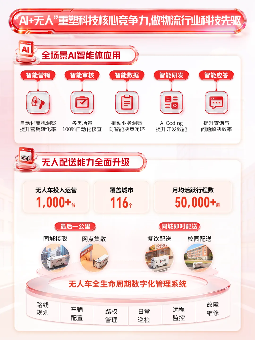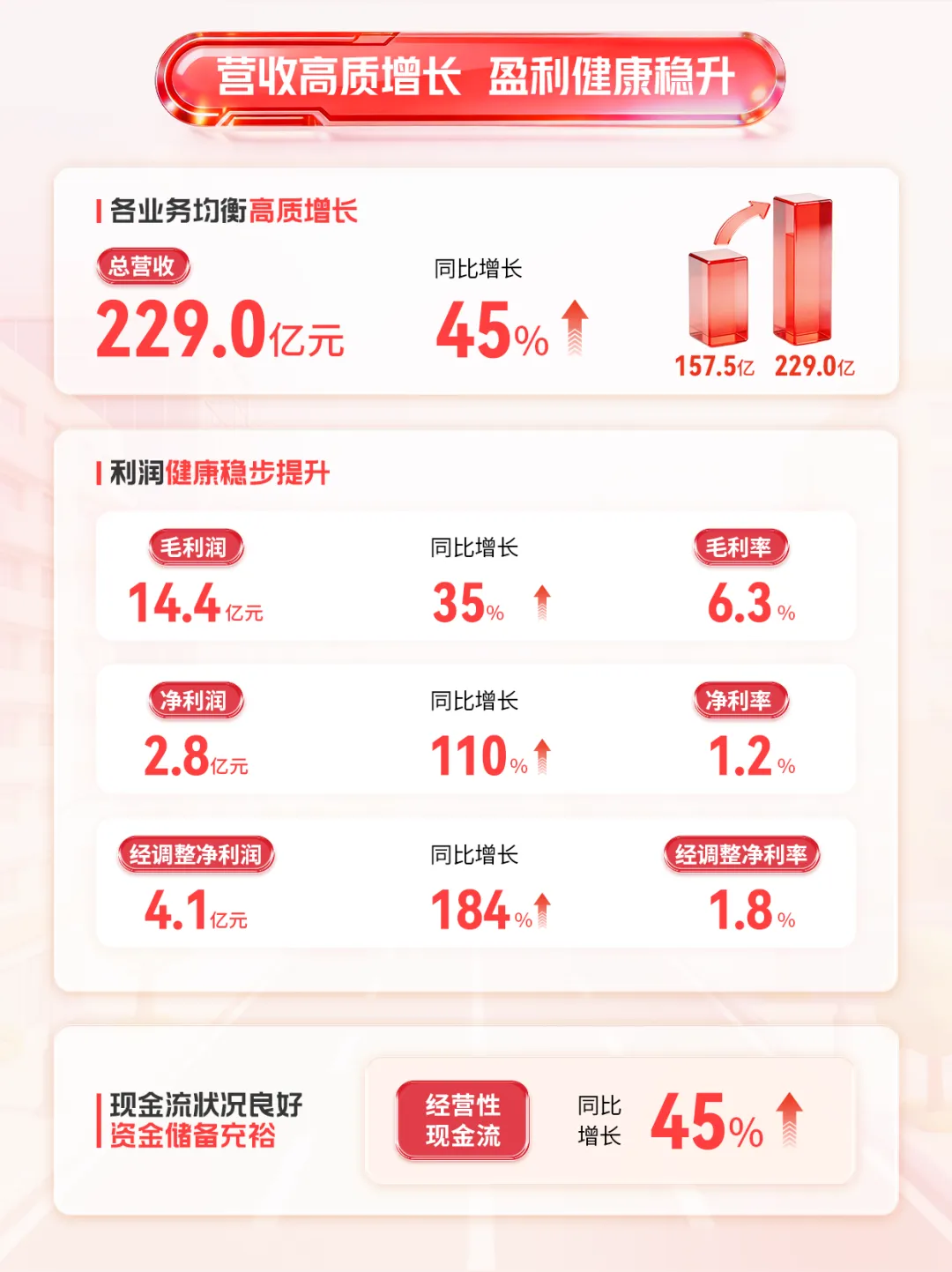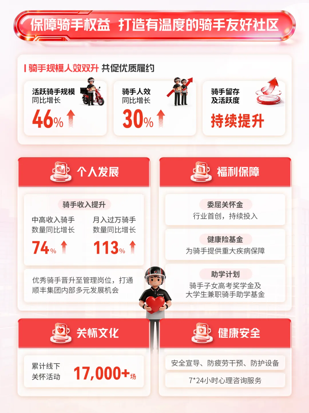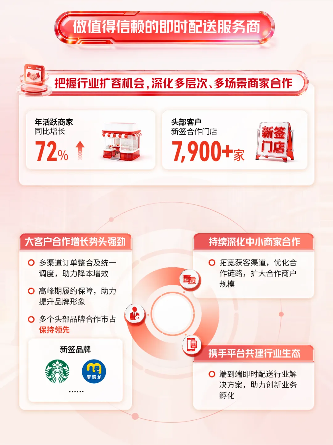 2025年全年,顺丰同城实现收入228.99亿元,同比增长45.4%;年活跃骑手扩大至约146万名,骑手人效同比提升30%。全面减少深圳存量的电动三轮中联即送拟将旗下蜂鸟即配(饿了么配送)业务主体公司落地莫城街道,并计划3年内在常熟打造中联即送“两基地两中心”车、电动两轮车,提升配送效率公告显示,顺丰同城全年实现收入228.99亿元,同比增长45.4%;同城配送服务的收入为134.67亿元,增长47.6%;最后一公里服务的收入为94.32亿元,同比增长42.4%;毛利及毛利率分别为14.45亿元及6.3%;本公司拥有人应占净利润及净利润率分别为人民币2.78亿元及1.2%;净利润同比翻倍增长,增速达109.7%;经调整净利润及经调整净利润率分别为4.15亿元及1.8%,经调整净利润同比增长184.3%;经营活动所得现金净额为3.95亿元,经营活动所得现金净额持续为正。面向商家的同城配送方面,顺丰同城以具有开放、灵活特性的即时配送网络,以及专业、高效与全场景的配送解决方案为商家赋能,保持广泛的商家合作。通过合作商户基数的增长及商户结构的调优,2025年,面向商家的同城配送服务实现收入人民币107.01亿元,同比增长60.0%。商家合作方面,服务商家规模持续增长,客户结构健康。报告期内,顺丰同城新增合作店超7900家。面向中小商家,顺丰同城持续拓宽获客渠道,优化合作链路,扩大合作商户规模,丰富合作商家类型。2025年,顺丰同城把握流量平台积极布局即时零售的行业趋势,深化与各大流量平台合作,不仅可在订单高峰期为餐饮外卖及即时零售平台提供弹性运力补充,同时也作为即时配送物流基础设施,为更广泛及多样化的流量平台提供高效且具有性价比的端到端解决方案,全面覆盖直播电商,商超小时达,私域零售等本地生活多种到家场景。报告期内,平台上的年活跃商家规模达到112万,同比增长72%。 其中,头部客户增长势头强劲,合作连锁品牌数量及占比持续提升,优质客户收入贡献占比提升。场景覆盖方面,顺丰同城依托全场景能力,围绕核心行业及品类优化产品及服务。餐饮方面,我们积极把握渠道多极化,品牌连锁化率提升等行业趋势,以中立开放第三方的独特市场定位为连锁餐饮客户提供多渠道订单集中化管理及配送服务,助力商家提升服务质量及降本增效,以更好地承接行业扩容带来的增量机会。报告期内,顺丰同城与多个餐饮连锁客户的合作收入实现快速增长。零售方面,顺丰同城持续迭代商超行业定制化解决方案,全城长距离配送、仓店小时达等标准化服务能力面向全国商超客户输出。 此外,顺丰同城积极布局即时零售行业生态,不仅与区域型头部连锁商超客户共同探索“前置仓同城即时配送”的一体化解决方案创新合作模式,更与多个头部闪电仓、传统零售行业连锁品牌、垂类平台等客户达成合作,报告期内商超行业配送收入同比增长超80%,全国头部连锁商超合作份额及承接门店数量快速提升。同时,美妆、数码、服装等非餐饮品类保持稳健增长。面向消费者的同城配送,顺丰同城致力于打造行业一流的专业即时履约服务。顺丰同城的“帮送、帮取、帮买及帮办”服务覆盖了生活帮忙、医疗健康、商务代办等个人生活和工作场景,强化“重要物品急送首选顺丰同城”的品牌形象。2025年,面向消费者的同城配送收入为人民币27.66亿元,同比增长13.7%。2025年,顺丰同城的最后一公里配送服务的收入为94.32亿元,同比增长42.4%,主要得益于:持续打磨末端履约能力,丰富末端产品矩阵,与主要客户加深网络融合及业务协同,各项合作业务渗透率平稳提升;积极承接主要客户电商件最后一公里配送业务,以更具性价比的弹性运力网络组织形式,助力客户满足更广泛的电商物流需求,包括电商件集收集派、电商退货件上门揽收等,报告期内电商件收入及订单量翻倍提升,带动业务规模增长;在揽收环节,作为弹性运力补充承接节假日、电商大促等物流高峰期的揽收需求,不断提升履约服务质量,客诉率低于行业平均水平,客户好评率持续提升。2025年揽收环节支持服务收入及订单量均实现翻倍增长;及在新场景探索上,积极开拓同城转运及接驳、大件配送等业务,并持续提升下沉市场最后一公里业务覆盖及能力,报告期间下沉市场最后一公里服务收入实现同比高双位数增长。顺丰同城表示:“骑手是我们最紧密的合作伙伴,我们拥有覆盖全国的弹性骑手运力网络。”报告期内,平台的年活跃骑手进一步扩大至约146万名,同比增长46%。骑手规模和效率的良好提升助力顺丰同城以更稳定的网络承接不断扩大的业务规模,报告期内骑手人效同比提升30%。顺丰同城丰富的业务场景为骑手带来多样化获得收入的机会,报告期内,中高收入水平骑手数同比增加74%,月均收入突破万元骑手数同比增加113%。顺丰同城亦严格落实平台责任,不断拓展骑手的权益保障服务,为骑手提供更为全面的专业赋能与发展支持。顺丰同城持续关注并提升骑手的平台体验、关怀福利与权益保障。顺丰同城重视骑手诉求,通过客服平台、有奖反馈及骑士交心会等多种线上线下渠道积极聆听骑手声音,并切实解决其问题。顺丰同城持续加大福利关怀投入,报告期内累计举办线下关怀活动超1.7万场,创新推出骑手生日关怀线上体系,持续扩大骑手关怀覆盖,致力于提升骑手满意度;同时,顺丰同城通过“助学计划”为骑手子女提供高考奖学金,并为兼职大学生骑