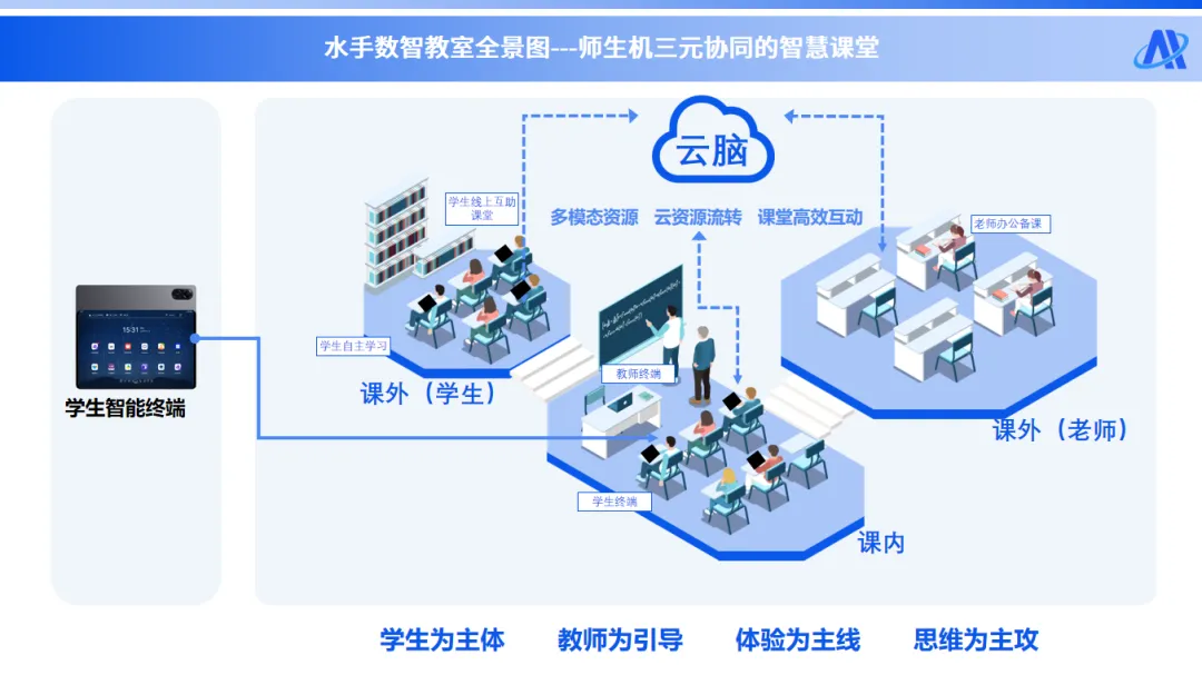 水手数智教室3.0以“云脑”为核心枢纽,搭建起覆盖课内课外、贯通师生全场景的智慧教育新范式,诠释了以“学生为主体、教师为引导、体验为主线、思维为主攻”的教育理念。水手数智教室3.0正以“师-生-机“三元协同为核心逻辑,依托“云脑”实现多模态教育资源的高效流转与课堂互动的精准赋能。