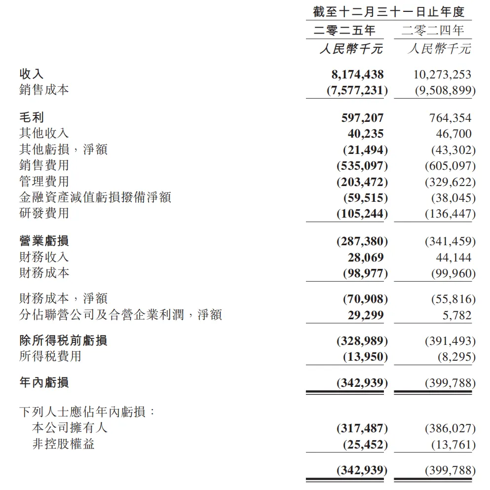 公告显示,2025年百果园实现营业收入81.74亿元,同比下滑20.4%;归属于公司所有者的净亏损3.17亿元,较2024年3.86亿元的亏损额收窄17.8%。