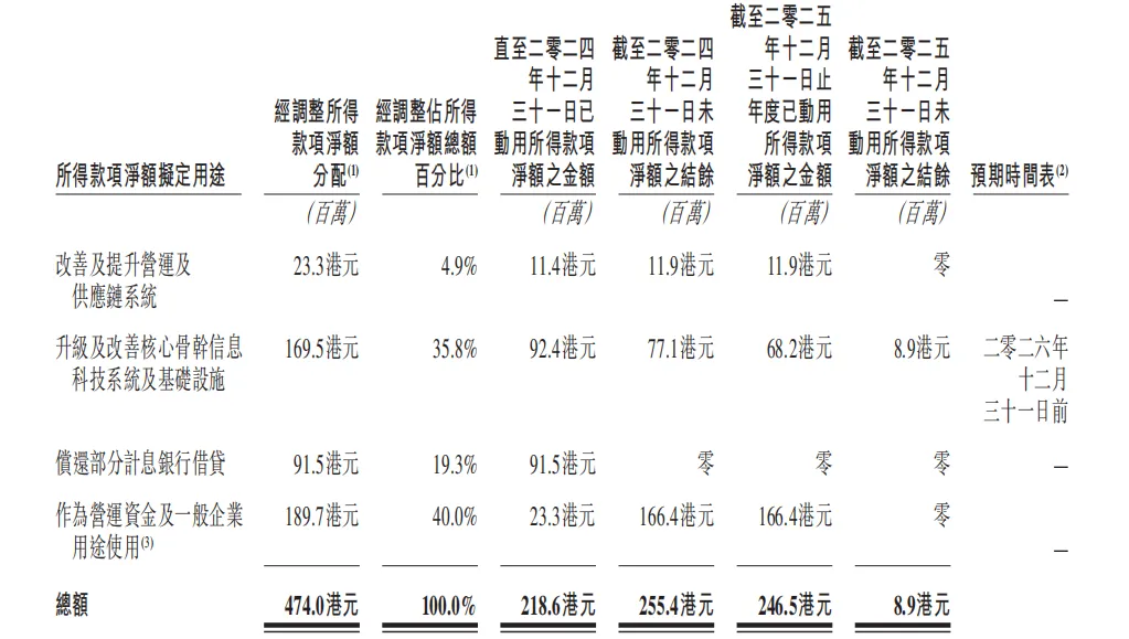 为缓解经营端的资金压力,百果园在2025年10月完成2.795亿股新H股的配售工作,所得款项净额约3.25亿港元。截至2025年末,该笔募集资金已使用2.97亿港元,资金主要投向日常业务贸易应付款项支付、银行贷款偿还两大方向。