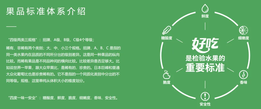 公司建立了“四度一味一安全”的果品分级标准,推出“不好吃三无退货”的终端服务政策,通过标准化的品质与服务承诺,建立起消费者的品牌信任,也获得了超出行业平均水平的品牌溢价,该体系也是吸引加盟商加入品牌体系的核心因素。