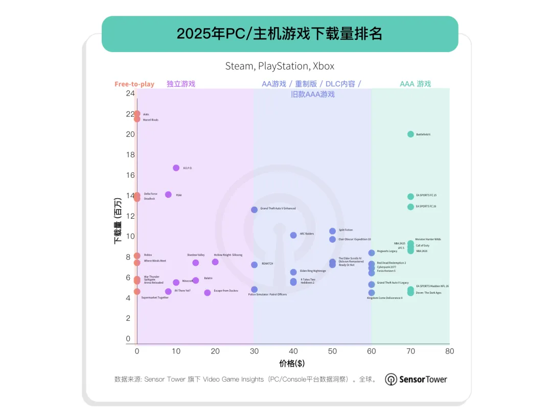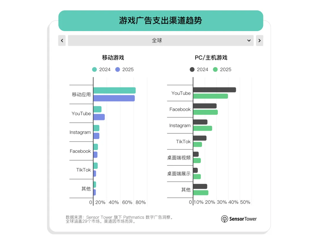 Sensor Tower《2026年游戏市场报告》分析移动游戏的市场表现、营销策略及运营活动趋势。同时还探讨了PC与主机市场之间的动态互动,并以射击游戏为核心案例进行深入解析。移动游戏带来广泛触达,PC与主机游戏提供更深度的体验2025年,全球游戏总下载量达到520亿次,其中绝大多数来自移动端。Google Play贡献了420亿次下载,其下载规模超过App Store的4倍以上。不过在游戏内购收入方面,App Store的表现依然更为突出,比Google Play高出约75%。与以免费游玩为主的移动游戏市场不同,PC与主机平台的下载往往与付费游戏购买直接相关,因此每一次下载通常对应更高的收入价值。在各大PC与主机平台中,Steam的下载量位居首位,比排名第二的 PlayStation高出约37%。不过,从整体规模来看,PlayStation与Xbox两者合计带来了11.7亿次下载,合计超过PC平台,显示出主机平台依然保持着强劲的市场需求。2025年,App Store与Google Play的收入连续第三年实现增长。下载量下降但用户使用时长略有提升,业正从依赖新增用户,转向更加重视用户生命周期的增长。游戏内购收入的增长主要来自欧洲市场,而美国整体表现相对平稳。美国和日本市场在经历2024年的下滑后,用户使用时长重新回升;中国大陆市场则有所下降。在欧洲市场中,英国表现有所增强,法国基本持平,而德国则略有走弱。随着安装量持续回落,行业增长已难以像过去那样依赖用户获取,团队需要将更多重心放在用户留存与重新激活上。在PC平台上,Steam在付费游戏收入、下载量以及新作发行数量等多个指标上均创下历史新高。表面来看,收入增长主要集中在AA与AAA级发行商,尤其是在动作与射击类游戏领域。在我们的分类体系中属于独立发行商,但其制作规模与商业表现已达到大型项目水准,并在2024年贡献了大量收入,从而显著抬高了当年独立发行商的整体收入。2025年独立发行商的收入增速似乎有所放缓;但若剔除《黑神话:悟空》的影响,独立发行商的收入实际上仍保持同比增长。YouTube广告投放份额从PC与主机平台向移动端转移移动游戏广告预算仍主要流向Applovin、AdMob等移动广告网络。相比之下,PC与主机游戏的广告投放更集中在社交媒体和视频平台,其中YouTube占据最大的投放份额。YouTube在移动游戏广告支出中的占比同比有所提升。相比之下,YouTube在PC与主机游戏广告投放中的占比有所下降,但仍然是该领域广告支出规模最大的渠道。与此同时,Instagram在PC与主机游戏广告中的份额显著提升,进一步印证了短视频广告形式与这类游戏的宣传需求高度契合,既适合展示预告片式创意内容,也有助于更高效地触达和再营销高意向玩家。2025年,在全球主要市场中,策略游戏带来了最显著的收入增长。这一趋势主要由东方发行商推出的一批4X策略游戏推动,其中《Last War: Survival》和《Whiteout Survival》表现尤为突出。解谜游戏同样实现了强劲增长,尤其是在欧洲市场《Royal Match》登上收入榜首,《Gossip Harbor》则贡献了最大的收入增量。射击游戏则在亚洲市场实现增长,主要受新作上线带动,其中《Delta Force》表现亮眼。在下载量方面,策略游戏是唯一在亚洲、北美和欧洲三大市场均实现增长的品类,进一步凸显其在关键指标上的强劲势头。相比之下,其他类型游戏在主要市场的下载量普遍下降,其中生活类、模拟类和解谜类降幅最为明显。在竞争激烈的射击游戏市场中,《Battlefield 6》成为2025年PC与主机平台最畅销作品2025年,《Battlefield 6》(战地6)的表现可谓一骑绝尘。除《EA SPORTS FC 25》和《EA SPORTS FC 26》之外,其销量几乎是其他大型游戏的两倍。这一年也是射击游戏竞争格外激烈的一年,多家重量级发行商推出新作,直接挑战长期占据市场主导地位的热门作品。除《Battlefield 6》外,网易推出的《Marvel Rivals》以微弱差距成为年度下载量第三的游戏;腾讯推出的跨平台作品《Delta Force》则在射击游戏中位列下载量第三。与此同时,Valve 的《Deadlock》以及由中型团队打造并迅速走红的《ARC Raiders》也相继加入竞争,使得射击游戏赛道迎来一波新作集中涌现。尽管如此,从2025年PC与主机平台的月均活跃用户规模来看,排名前列的射击游戏仍然是《Fortnite》、《Counter-Strike 2》、《Call of Duty》和《PUBG》,《Battlefield 6》位列第五。对于这些新进入者而言,要真正撼动现有格局仍需时间。
