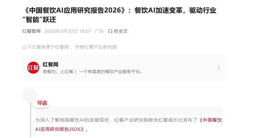 今天无意中刷到了红餐网发布的《中国餐饮AI应用研究报告2026》我看完文章之后又下载了PDF资料,读完之后说说我的感受。