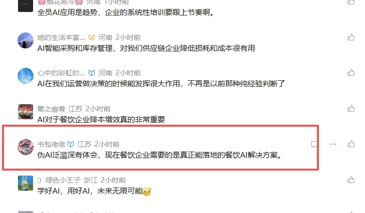 但凡你有点餐饮运营经验,加上你懂点AI,出具这种方案都不难,但为什么后面我没有去成餐饮AI平台,因为我发现每个企业的情况都不一样,当时我们调研了重庆本地的火锅店和外地的小吃连锁店,都是不小的规模,有些老板反馈的是,并不清楚能给公司带来什么收益,而有些反馈的则是不看好这种模式。
