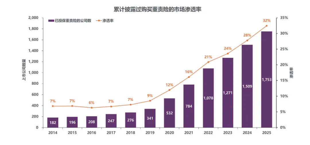 与大家想象的不一样,董责险不再是少数企业的冷门选择。截至2025年底,公告投保董责险的上市公司渗透率已经达到 32%,而在5年前(2020年),这个数字只有12%。即使与2024年相比,同比又提升了4个百分点,呈现出极其稳健的逐年递增态势 。