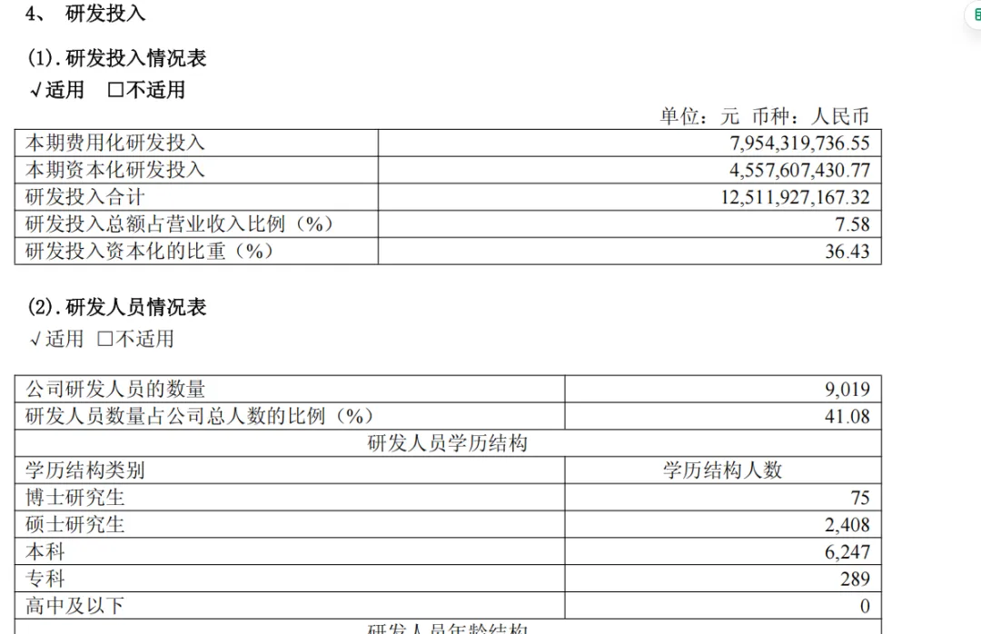 报告期内,公司研发投入125.1亿元,较上年同期增加54.6亿元,同比增长77.4%;研发费用79.5亿元,较上年同期增加23.7亿元,同比增长 42.4%;研发人员9,019 人,较上年同期增加2,818人,占公司总人数的比例提升至41.1%。
