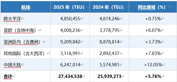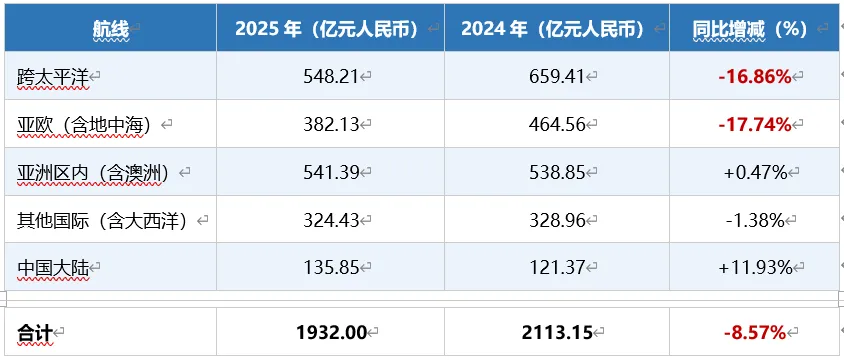 受全球运价下行影响,跨太平洋和亚欧两大主干航线收入降幅最为显著(分别-16.86%和-17.74%),主因是运价较2024年高位明显回落;而中国大陆内贸航线增幅11.93%,亚洲区内航线基本持平,展现出一定的抗周期性。