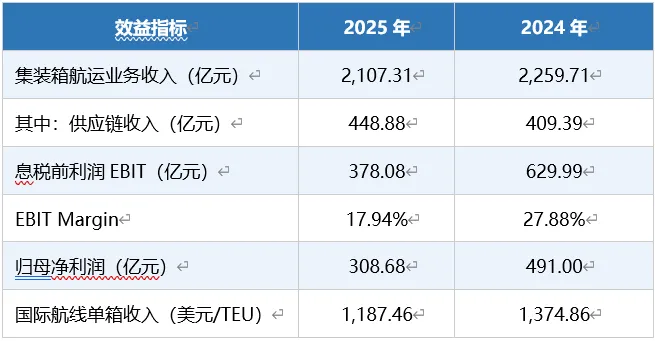 2025年,在全球集装箱航运市场运价总体回落、贸易政策频繁调整的复杂背景下,中远海控仍实现了归属于上市公司股东的净利润308.68亿元,基本每股收益1.99元/股。全年营业收入2,195.04亿元,同比减少143.55亿元,降幅6.14%;息税前利润(EBIT)450.13亿元;净利润352.28亿元。公司整体保持了较强的盈利能力和经营韧性。