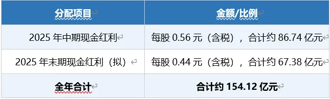 公司2025年度预计共派发现金红利约154.12亿元,占本年度归属于上市公司股东净利润的比例约50%。