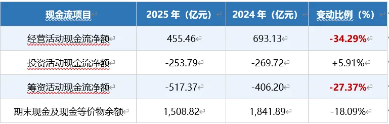 2025年本集团经营活动现金净流入455.46亿元,同比减少净流入237.67亿元,降幅34.29%,主要是集装箱航运业务经营业绩同比下降所致。截至2025年末,现金及现金等价物余额1,508.82亿元,比上年末减少333.07亿元。