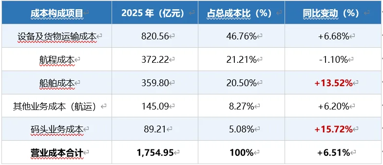 船舶成本增幅最大(+13.52%),反映了公司扩张运力及绿色船队升级的资本投入;航程成本小幅下降(-1.10%),与红海航线因局势缓和带来的绕行成本改善有关。码头业务成本增幅(+15.72%)高于收入增幅(+11.39%),需持续关注码头业务的成本管控。