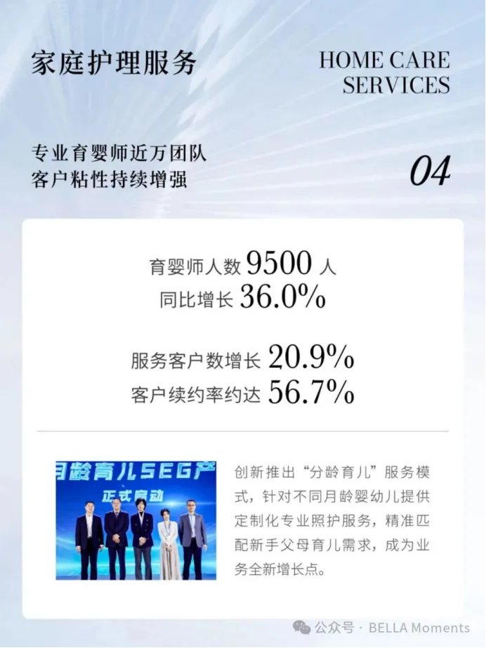 AI业务:二零二五年为本集团AI战略元年,集团正式完成从传统高端家庭护理服务提供商向AI驱动的全场景智慧决策大平台的转型,旨在破解全球高端家庭护理行业百年来的“非标准化、强人力依赖、跨区域模式化混乱”的发展魔咒,实现从线性门店扩张向指数量级增长的业务模式升级。年内,集团正式推出自主研发的垂类AI大模型“贝拉博士”,依托千万级真实实践数据打造孕产育全周期智能服务入口,打通全生命周期服务闭环;投资千万元人民币打造母婴AI服务平台WITH 1000 AI,夯实数字墙并落地百家合作机构SaaS服务;与云爬科技达成战略合作探索机器人落地并完成核心舱智能测试;同时布局具备智能产线的基础设施,深化产线协同。AI业务构建了海量、技能、场景双方向的AI飞轮,全面强化了本集团单位的核心竞争能力。