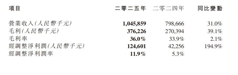 2025年全年实现净利润人民币4.11亿元;实现经调整净利润人民币1.25亿元,经调整净利润率11.9%,同比提升6.6个百分点。