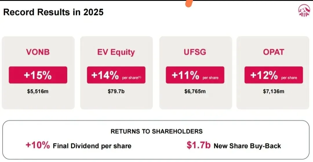 全年保险收入110.8亿美元,同比增长7%,新业务利润增长12%到27.82亿美元,经营自由盈余30.59亿美元,同比增长15%。它不做过度的收益平滑,因此财报的波动相对较大。但这种激进风格背后,是 12%增长的新业务利润 和 15%增长的每股股息。