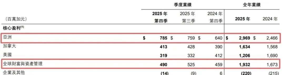 基本净收益 42.01亿加元,同比增长9%,基本股权收益达18.2%,年底资产管理总值1.6成加元,同比增长4%;亚洲市场成为核心增长,基本净收入8.36亿加元,暴涨 19%,香港业务迎来断层式领先。