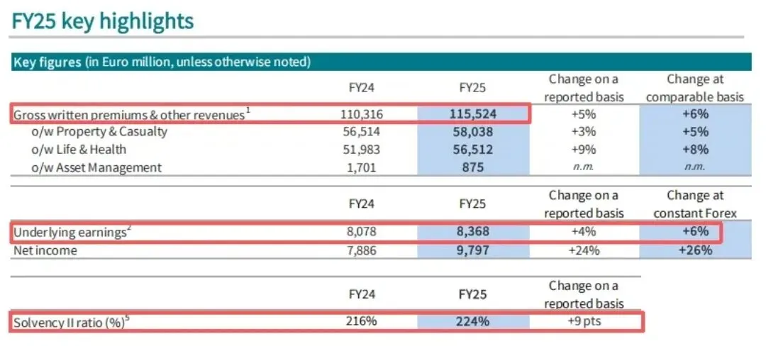 224%的偿付能力充足率,这是一个让监管都放心的数据。总收入近1160亿欧元,同比增长6%,基础收益达84亿欧元,同比提升6%; 核心偿付能力充足率升到224%,全球布局均衡。
